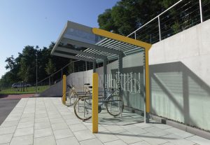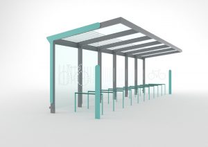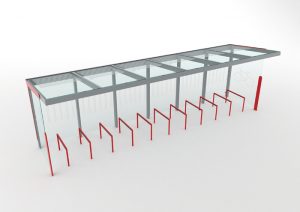 Design is based on the aureo bus shelter range offering two roof shape options – flat and arched. Modular structure has deeper roof protecting bicycles parked underneath and increased height enables two-tier bicycle parking. Walls are made of tempered glass with safety serigraphy. The shelter can be optionally supplied with two-tier bicycle rack system.