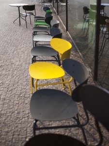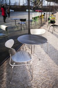 A universal outdoor chair unafraid of drawing inspiration from the past. This is a modern interpretation of classic school chairs familiar to millions of students, which has found new life as part of the facilities at parks, outdoor cafe terraces, and all kinds of public spaces. Durable, distinctive, with a hint of retro styling, and yet totally contemporary. Available in two heights and fully stackable. The plywood model is designed for interior use. A table in the same style is also available as part of a set.