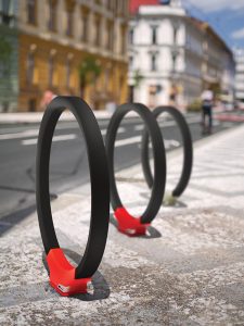 A stand with a minimalist circular form for a unique side profile. It is composed of a pair of materials: a galvanised steel frame on the inside, with an external coating of durable rubber. The ring is seated in a subtle aluminium alloy bracket. The stand is strong enough to support your bicycle, but soft enough not to damage it. A simple circle with no superfluous decorations, it suits any architectural context, in any given situation, whether it’s installed individually, in small groups, or in long rows for a subtle interplay of circular forms.