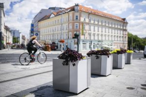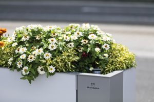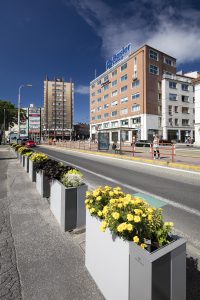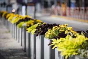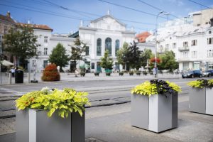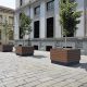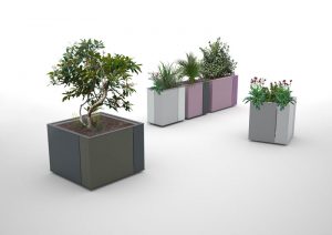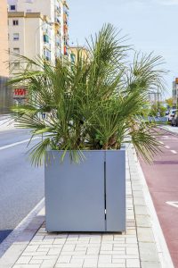 A new range of planters with self-irrigation. Sheathing panels made of aluminium sheet bent over corners are asymmetrically divided and provide the product with its distinctive and unique look. Thanks to the simple shape, the planter suits any location from big squares, where the monumental square version is the best choice, or malls with narrow space where rectangular planter fits the best.