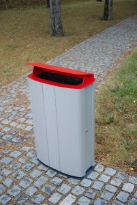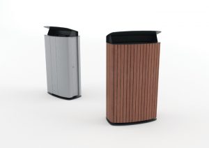 The casing is made of anodised aluminium profiles or wooden lamellas, upper frame and cover of steel sheet treated with zinc coating and powder coating. Door to be side-forward opened, either with liner of zinc coated steel or steel frame for plastic bag attachment.