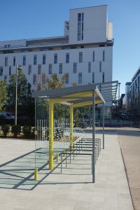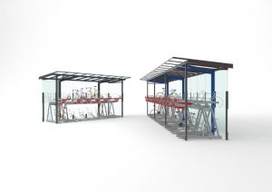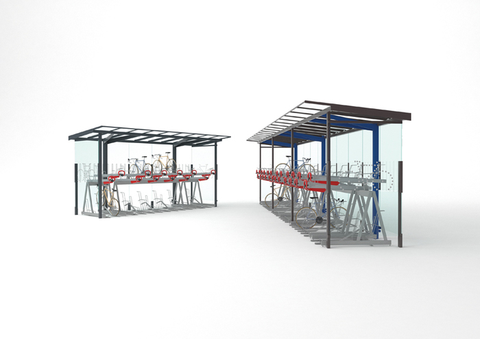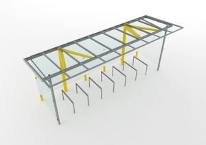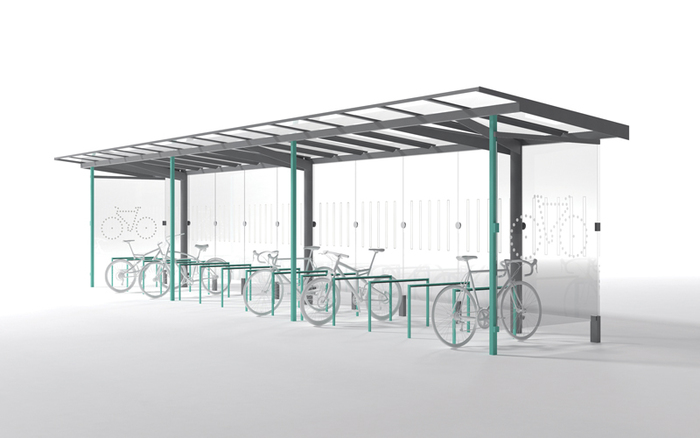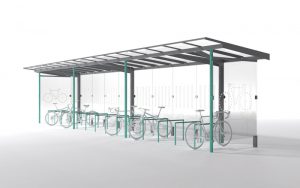 Design is based on the regio bus shelter range. The deeper roof is supported by V-shaped consoles welded to the cylindrical columns. Increased height enables two-tier bicycle parking and thanks to the modular design the shelter can be extended to accommodate larger capacity of bicycles. The shelter can be optionally supplied with two-tier bicycle rack system.
