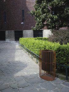 Constructed from galvanized powder-coated steel rounds, fitted with either a flexible rim at the top for fitting plastic bin bags, or an industrial plastic inner liner. Anchors to the ground.