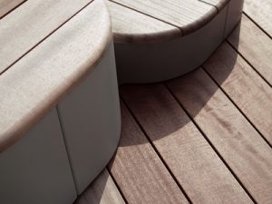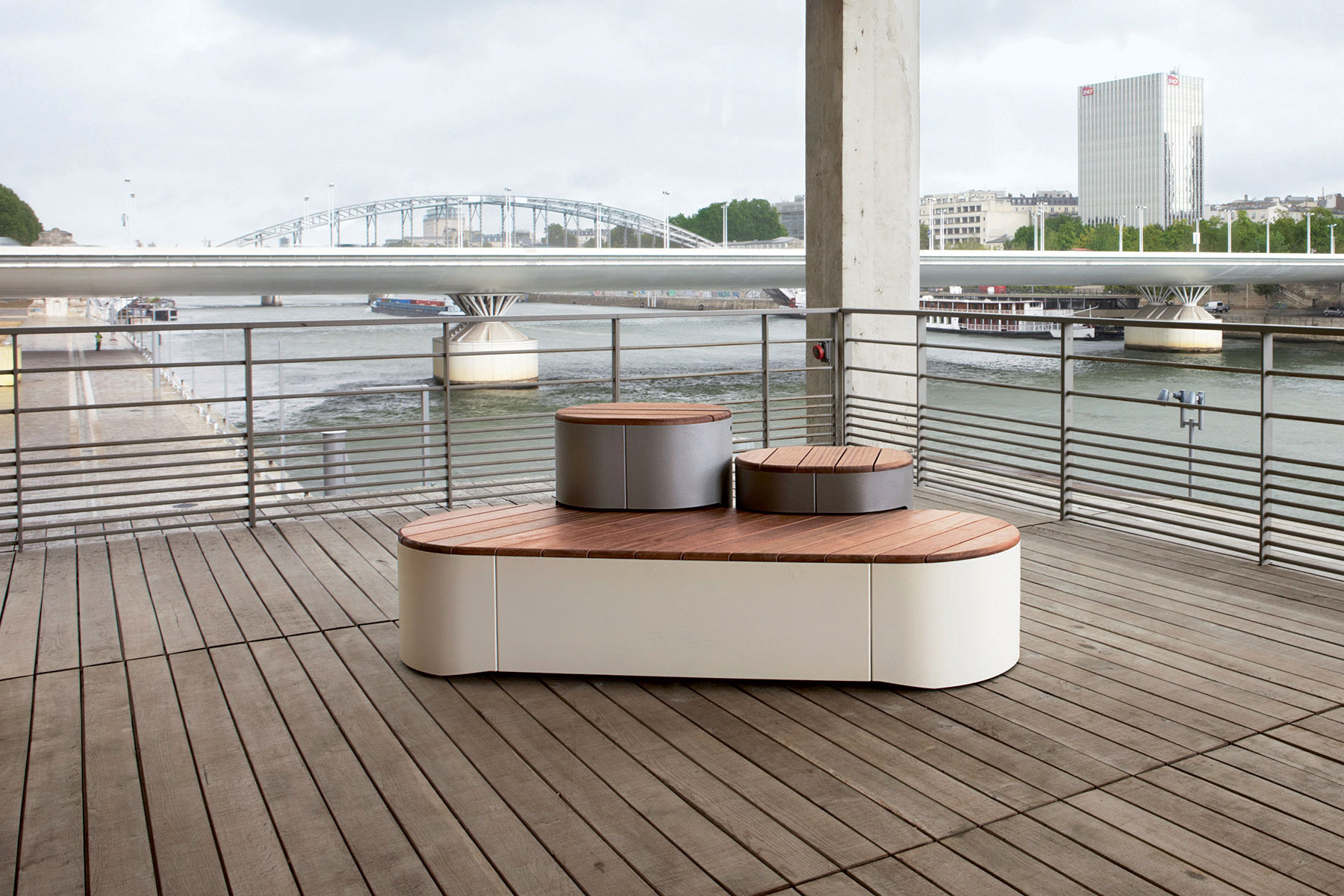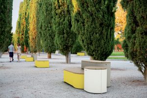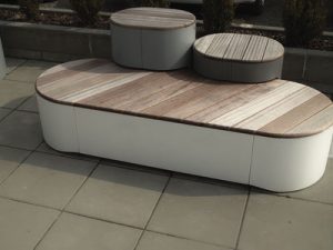 Large Island for sitting, the higher one serves to lay the laptop, the highest one as a backrest. The unique shape based on simple geometry of several oval features and three levels of horizontal surfaces offer a new perspective on the seating elements in urban spaces. Modules can stand alone or be linked in a playful archipelago. Intersection of shapes, various orientations of wooden panels and different colours of corpuses complete the overall effect. Wood on the horizontal surfaces may be replaced with high-pressure laminate (HPL) whose smooth surfaces, colour and graphic diversity create yet a different graphic character. Possibility of combination is not unlimited but is so wide that it will satisfy any creative architect who desires something new and unusual for his project.