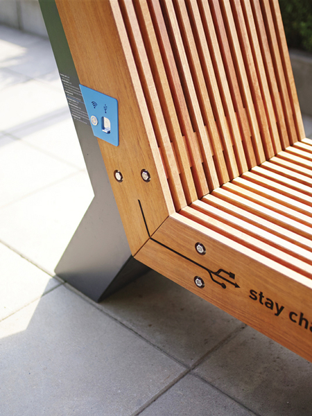 While it might look like a dynamic sculpture, woody scorpio is no art for art’s sake. The attractively shaped leg is home to a solar panel which provides power to charging points along the length of the side of the bench as well as a Wi-Fi point. The panel can be adjusted to the optimal position relative to the sun, and the leg contains batteries and other advanced technology which enable its use on cloudy days and even at night. woody scorpio is available in all colour configurations of the base woody model. In addition to the standard straight model, the seat, inspired by the aesthetic of stored lumber, can be ordered in an open V shape, a flat Z, a triangle or even a square. Being able to combine the bench with the rest of the woody range and other pieces of street furniture was one of our key focuses during development, and the result shows that this goal has been achieved. The bench is equipped with an adjustable 140Wp solar panel and two double USB sockets for charging mobile devices, and also features 24-hour Wi-Fi capabilities with a range of 100 metres. Some models feature additional functions, such as a bicycle stand and a tree protector.